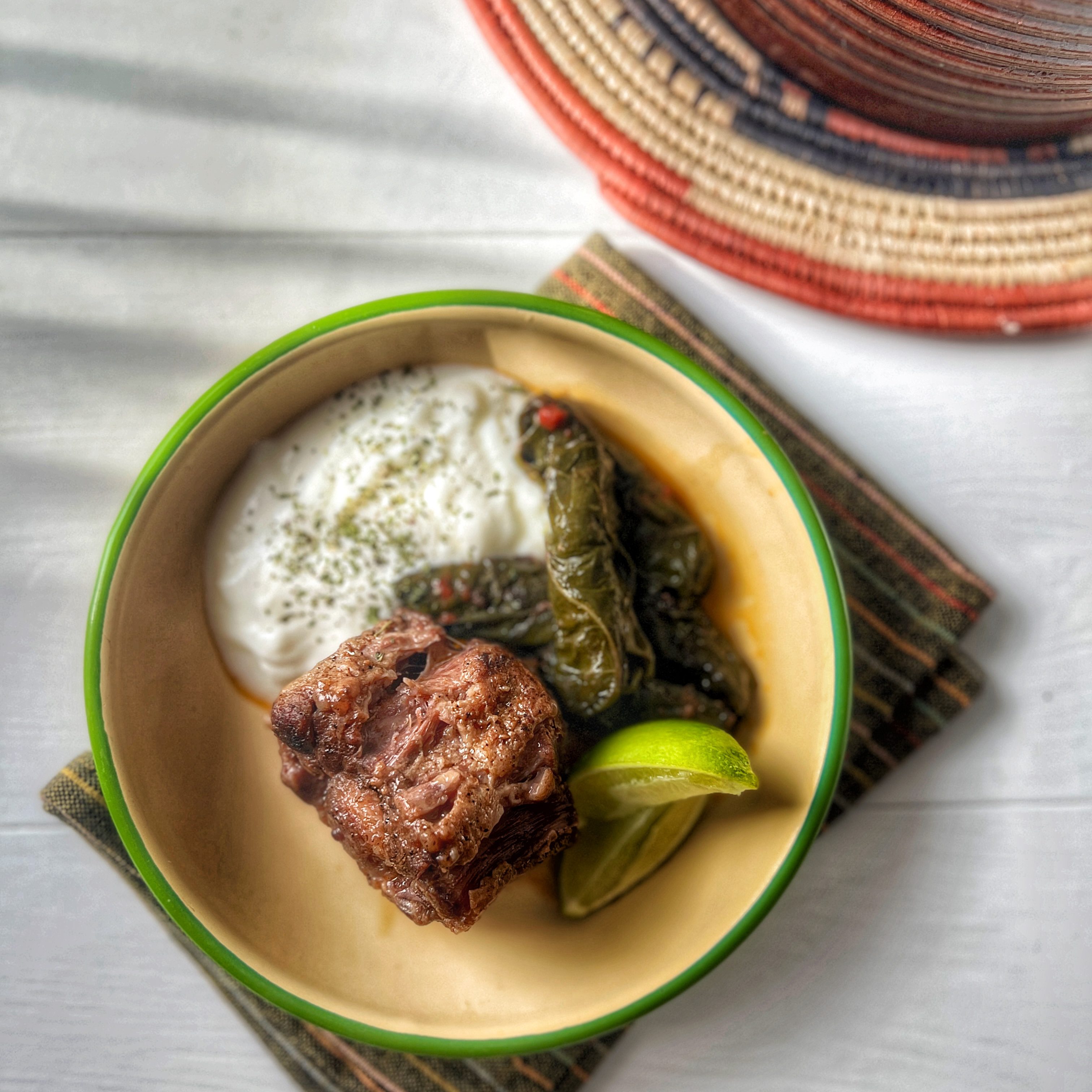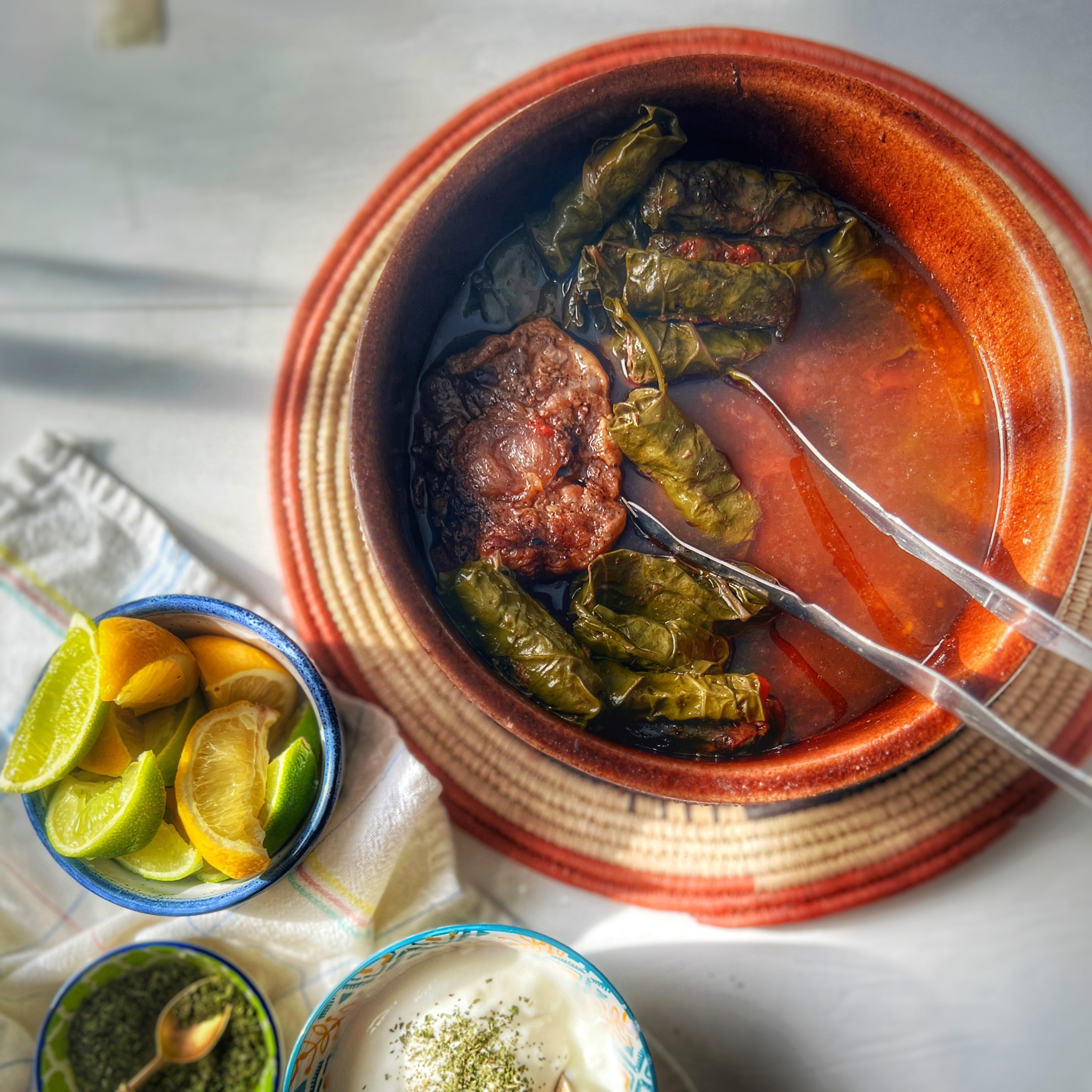 On my last trip to Egypt in April 2023, I was introduced to a trending dish that consists of slim rolled grape leaves cooked low and slow with hearty oxtail pieces in a deep clay pot. The tagen comes to your table with an unmistakable bubbling noise that adds a certain allure to the whole food experience. I came back from Cairo to the US with a nagging intention to recreate this fascinating dish in my own kitchen. While I had jars of pickled grape leaves stacked, I decided to swap in a vibrant bunch of springy Swiss chard that stole my heart at the open market.