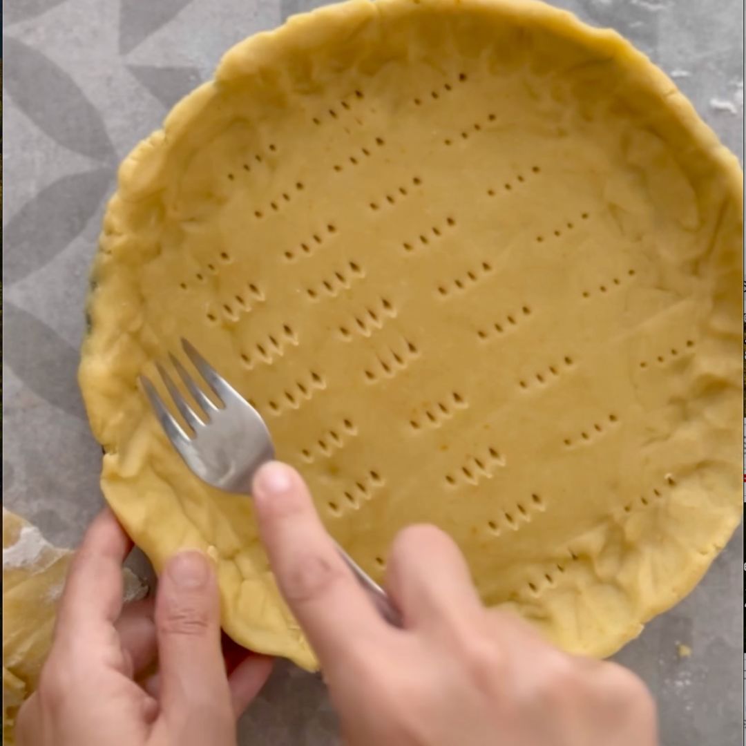 3. Divide the dough into 1/3 and 2/3. Keep the 1/3 wrapped in plastic wrap in the fridge while you spread with your hands the ⅔ dough in the tart pan. Make sure the sides are lined all the way up with a thick layer of dough.