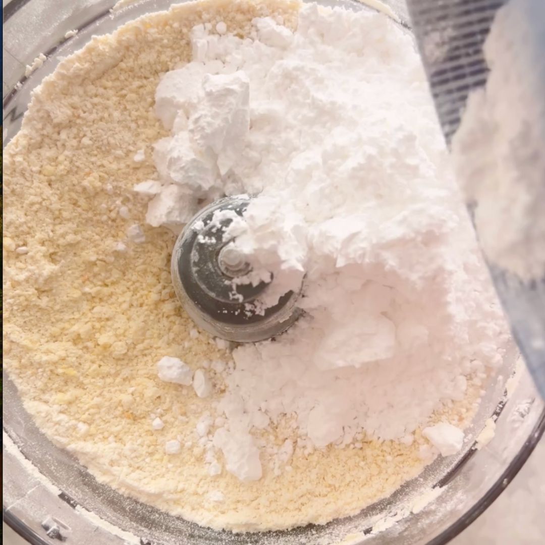 1. Combine the flour, fine salt, and cubed butter in the food processor. Pulse a few times until the cold butter is incorporated into the flour, and the mixture has a sandy texture.